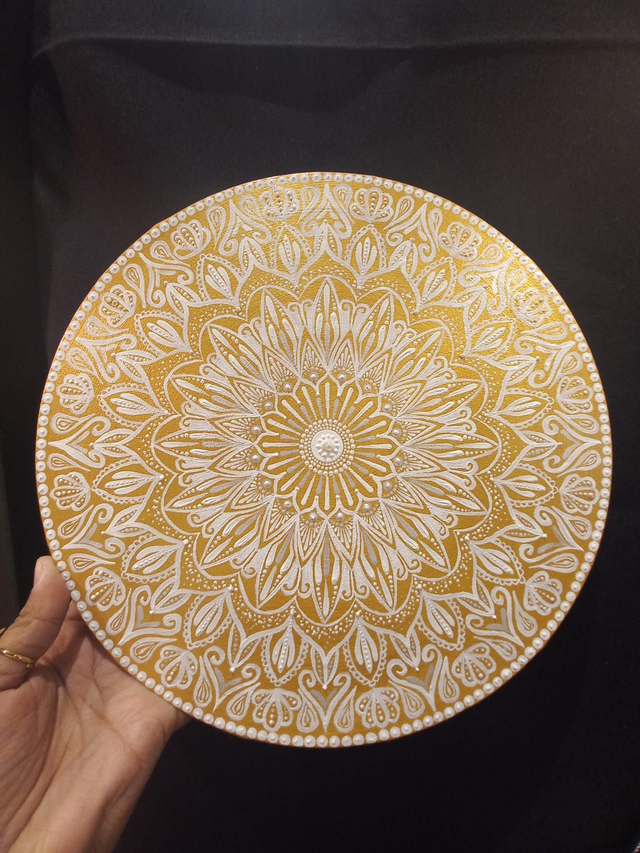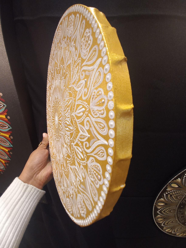 Ce mandala par ses motifs tels de la dentelle honore la délicatesse. Alliée à la finesse et la pureté du blanc, la couleur or peut avoir beaucoup de significations.